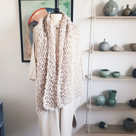 Langt beige halstørklæde med frynser.