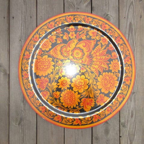 Lille retro samling af traditionelt russisk Khokhloma folketrækunst, som er et folkehåndværk kendt for sine karakteristiske mønstre - blomstermotiver, der kombinerer røde, grønne og guldnuancer på en sort baggrund.
