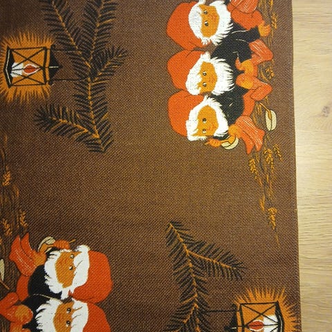 To retro juleløbere med nissetog. Tryk på hessian. Der er nogle få pletter men ellers pæne alderen taget i betragtning.