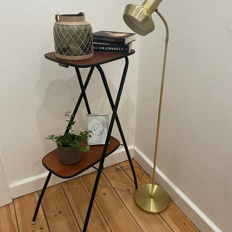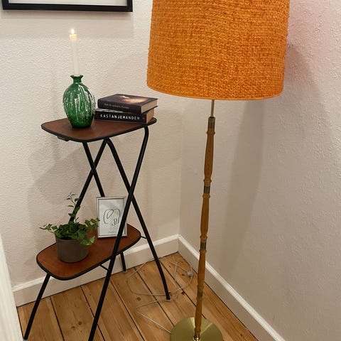 Fin og speciel gulvlampe hvor foden er en 155 mm patron hylster og "projektet" er fremstillet i træ og tre tynde messing rør hvori der er ført ledning og gennem de to af dem.