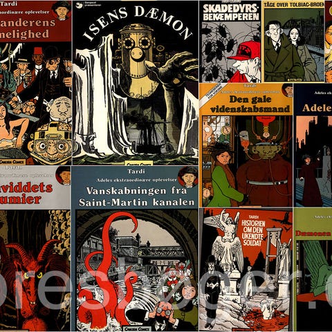 Tardi og Manchette Griffu tegneserie med illustrationer og tekst på dansk. Produktet indeholder en tegneserie bog med en karakter, der holder en pistol. Farven på omslaget er primært brun med gule og sorte detaljer.