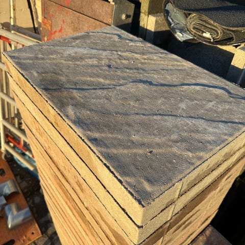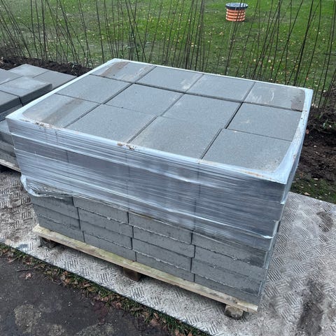 Grå betonfliser str. 40x40x8 cm., nye, har 191 stk pris pr. stk. 15kr alle for 2.500,00kr Excel. paller.