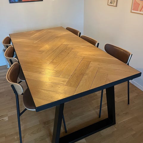 Bordet er speciallavet ud fra eget ønske. Bordet er lyst egetræ, lavet i sildebens mønster.