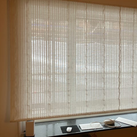 Foldegardiner med beige stof og træpinde foroven og forneden