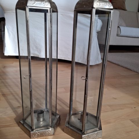 Hængelamper, Lisbeth Dahl, 8 små holdere til fyrfadslys. Er lavet i glas med metalpynt på. Nogle af kæderne skal limes da de er faldetaf. De kan evt hæges i et træ eller et udhus som pynt .