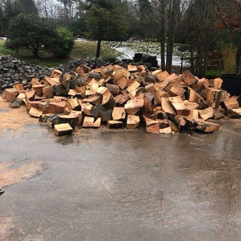 Brænde i form af træstykker til brug i brændeovn eller til opvarmning. Træet er savet i forskellige størrelser og kan anvendes til brænde til boligopvarmning eller udendørs bål.