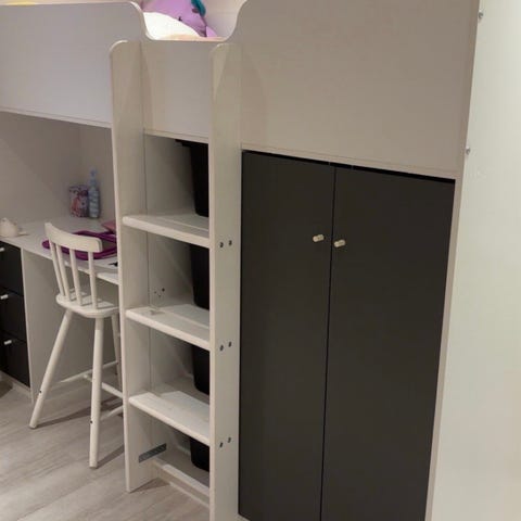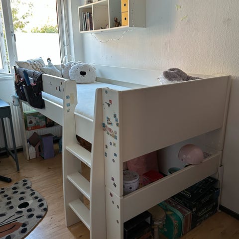 Højseng i hvid med integreret stige (kan skifte plads) og opbevaringsskuffer på begge sider. Sengen er designet til børn. Materialet er træ, og den har en enkel og funktionel opbygning. Med instruktioner til montering. Til afhent.