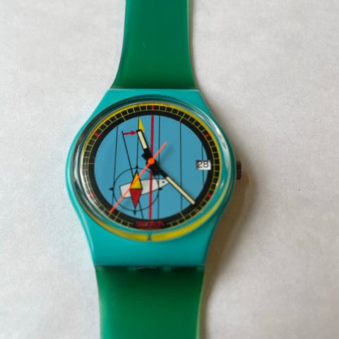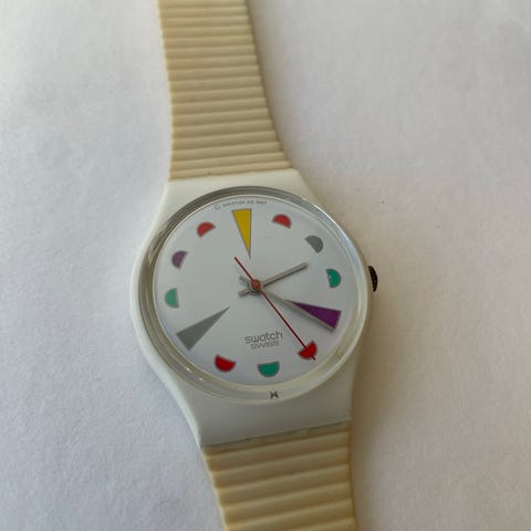 Et klassisk Swatch GL100 Tonga fra forårs/sommerkollektionen 1986 – et ur kendt for sin stærke 80’er-æstetik med den ikoniske zigzag-skive og de kontrastfulde remfarver. Uret er i brugt, men pæn stand for alderen, og fungerer som det skal. Rem og glas viser almindelige brugsspor, men helhedsindtrykket er stadig flot. Et perfekt samlerur til dig, der elsker de tidlige Swatch-designs og deres unikke farveunivers. Et sjovt, farverigt og karakteristisk stykke Swatch-historie.