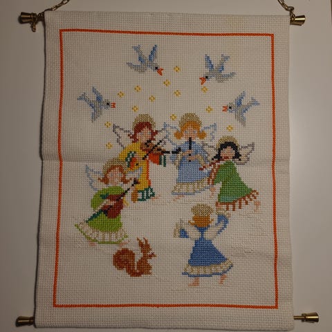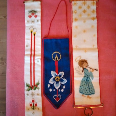 Broderede ophæng/klokkestrenge med fine julemotiver.