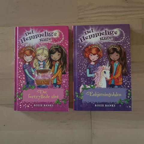Rosie Banks Det Hemmelige Rige børnebog med titlen Det fortryllede slot. Bogen er designet til børn og indeholder en farverig illustration på forsiden med tre piger og en skattekiste.