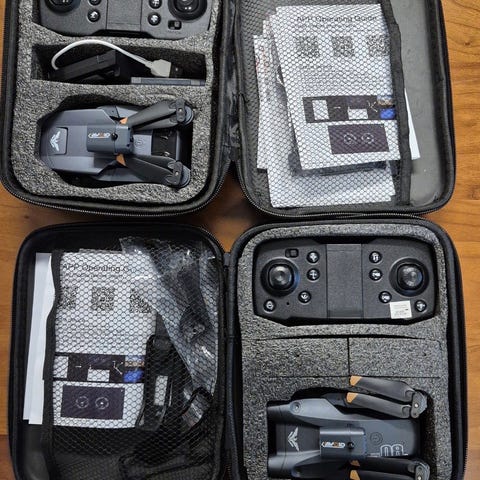 Hubsan X4 Air Basic drone med fjernbetjening. Inkluderer ekstra propeller og tilbehør til vedligeholdelse. Dronen har fire rotorer og en kompakt størrelse, velegnet til indendørs og udendørs brug. 16GB SD Kort medfølger.