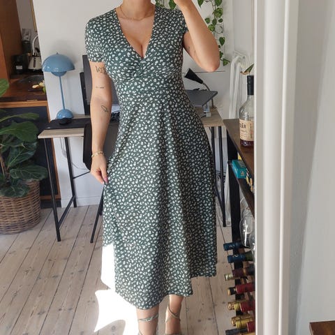 Fin lysegrøn sommerkjole med hvide blomster og v-neck