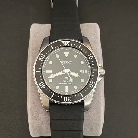 Med sort silikonerem. Et super ur til farverige nato-remme, som kan tilkøbes billigt.