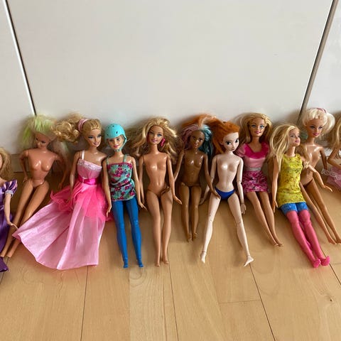 Barbie dukker med forskelligt tøj og tilbehør. Sættet indeholder flere dukker i forskellige udgaver, herunder prinsessedragter og havfruedragter. Dukkerne er uden tøj på billederne, men inkluderer flere beklædningsdele og tilbehør. Egnet til børn, der ønsker at lege med Barbie-dukker og skabe forskellige rollespilsscenarier.