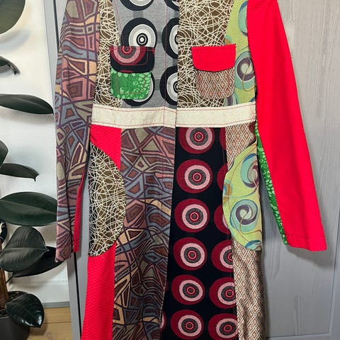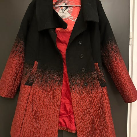 Fed frakke med lynlås hele vejen ned. Patchwork mest med cowboystøvler og med tweed ærmer. Masser af lommer. Flotte detaljer. Fint farverigt for