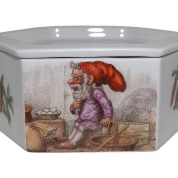 Bing & Grøndahl, sekskantet skål med låg dekoreret med nisser.