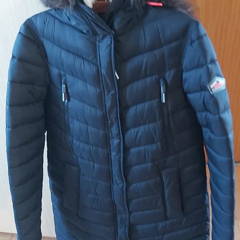 Superdry Vinterjakke i størrelse S til kvinder. Jakken er sort og lavet af dun, hvilket giver god isolering og varme til kolde vejrforhold.