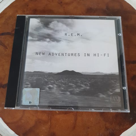 R.E.M. New Adventures In Hi-Fi CD med sort-hvid cover og landskabsbillede.