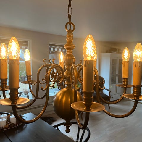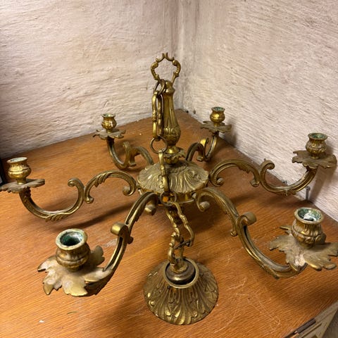 Stearin-lysekronen har en klassisk fremtoning med flere arme og detaljeret udsmykning. Den er lavet af metal med en patineret overflade.