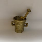 Produktet er en skål med håndtag og en morter. Den har en glat, metaloverflade og en gylden farve.,Bemærk at mail, chat og beskeder ikke besvares, og varen skal købes på knappen "Gå til varen"