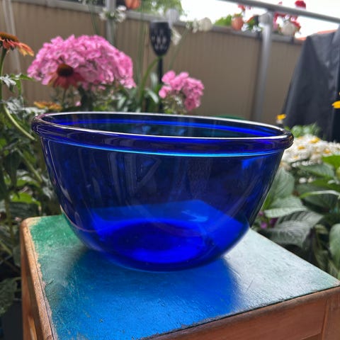 Retro blå emalje og glas røreskål