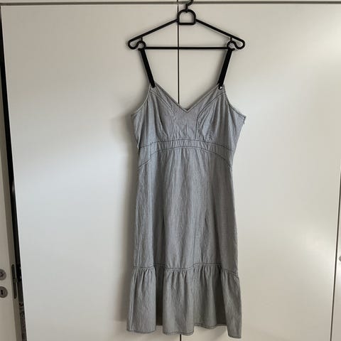 Flot ny Franca kjole med indstillinge stropper og lang lynlås i siden der gør det let at få kjolen af og på, i blå og hvidstribet bæk og bølge stof, str. L.