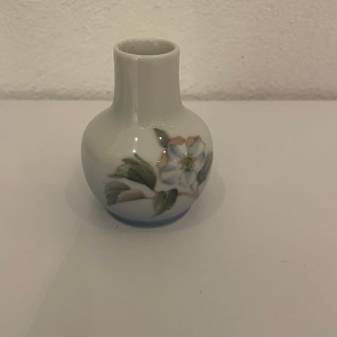 Elegant miniature vase fra Royal Copenhagen, vasen håndmalet med en marguerit og en blå sommerfugl. Vasen har en blød, rund form og de karakteristiske fine detaljer, som kendetegner porcelænet fra royal copenhagen i perioden 1960'erne-1970'erne. Vasen fremstår i god stand uden skår eller mangler i glasuren, den måler 6,5 vm i højden og har en diameter i midten på cirka 8 cm.