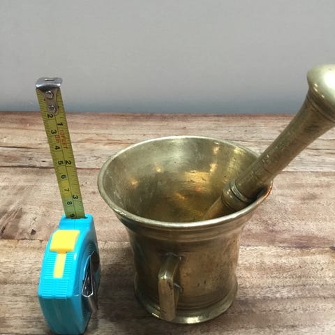 Morter, Diameter øverst12,5cm. Højde 11,5cm. Pistellængde 20cm.