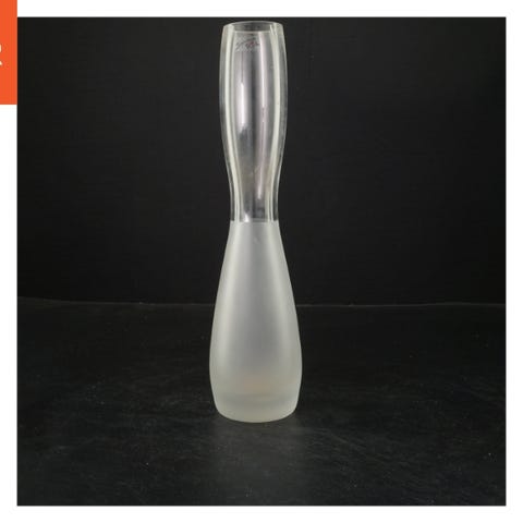 Dette er en lilla vase med rillede sider og en bølget kant på toppen. Den er lavet af glas og har en diameter på 14 cm samt en højde på 17 cm. Vasen er ideel til at holde blomster og kan anvendes som en dekoration i hjemmet. Bunden af vasen viser en stregkode, hvilket indikerer den tilhører en bestemt designserie eller producent. Tags: glasvase, blomsterholder, dekoration, violet.
