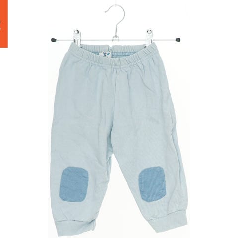 Dette er et par babybukser i hvid farve. Bukserne har et elastisk bånd i taljen og et trykt mønster bestående af små figurer og ansigter i en lys blå farve rundt omkring på stoffet.