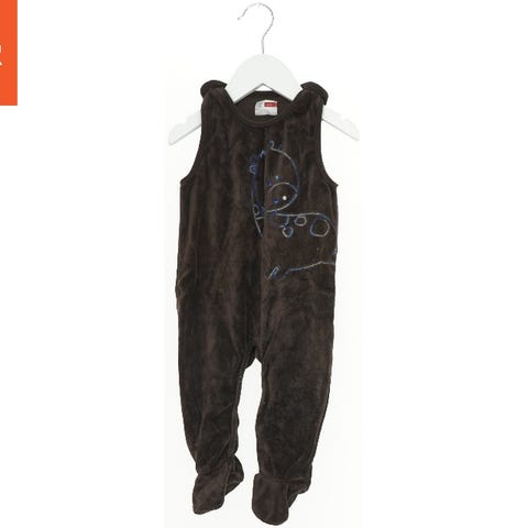 Sparkedragt i blød lyseblå stof med mørkeblå paneler på siderne. Den har broderede figurer på brystet og bagpå ved nakken. Dragten har fødder og knaplukning i bunden.