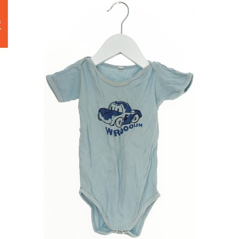 En beige baby bodystocking med korte ærmer. Den har et print foran med teksten 'Say Cheese...' og to små giraffer. Der er trykknapper i bunden for nem lukning.