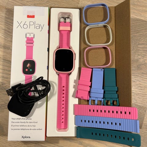 Xplora X6 Play smartwatch børneur med sort rem og pink urkasse. Uret har touchskærm og leveres med opladerkabel og original emballage.