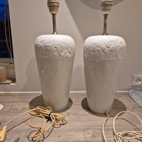 Lampe, ROYAL COPENHAGEN, Smuk og enkel bordlampe i porcelæn fra Royal Copenhagen, DEAUVILLE - designer Annegrete Halling Koch - højde48 cm incl. skærmholder - hvide med blomster i sarte pastelfarver foroven - fuldstændig fejlfri - købspris 1994 kr. 2.500,- - sælges for 400,- uden skærm - se også større lamper i samme serie i anden annonce