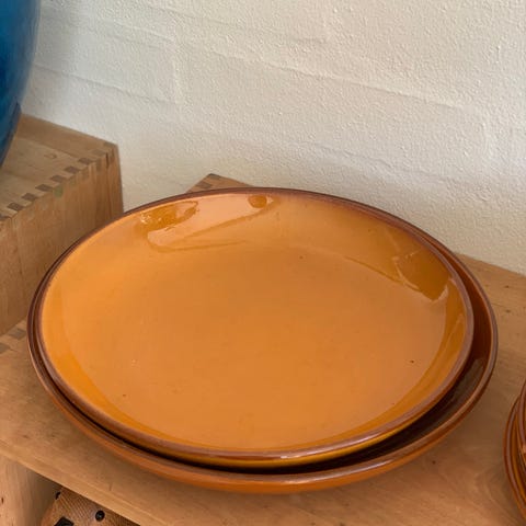 Smukke tallerkner i lertøj fra den klassiske “Gule Marie”-serie, produceret fra ca. 1941 til 1960’erne. Serien er kendt for sin varme ravfarvede/okkergule glasur, som varierer en smule fra del til del – en del af charmen ved det håndlavede udtryk. Perfekte både til brug og som smukt vintage-stel i køkkenet.