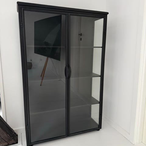 Vintage vitrineskab i sort metal fra BoConcept med god plads. 4 dybe hyldepladser. Skabe kan åbnes både foran og siderne.