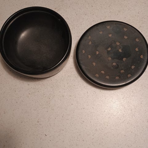 Lille og fin keramisk krukke med teksten "Muskat" (muskatnød) påskrevet i blåt og hvidt design. Til dekorativ opbevaring af muskatnødder. Med låg. Højde: cirka 7 cm, diameter: cirka 5 cm.