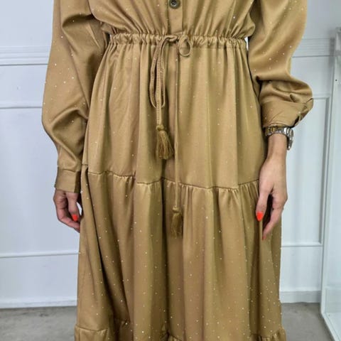 Lang kjole med lag på lag look. Hele kjolen er pyntet med skinnende similisten. Der er knapper ved brystet og snøre i taljen, som kan bindes ind.