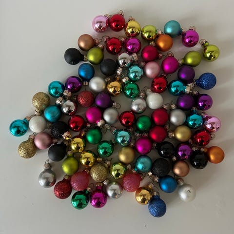 Små glas juletræskugler i grønne og gyldne farver