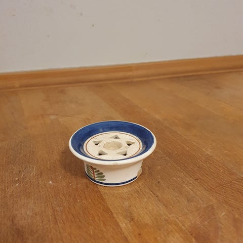 Den er kongeblå og i meget god stand, den har på kanten en medfødt lille nist der ikke har fået glasur fra produktionen. se foto