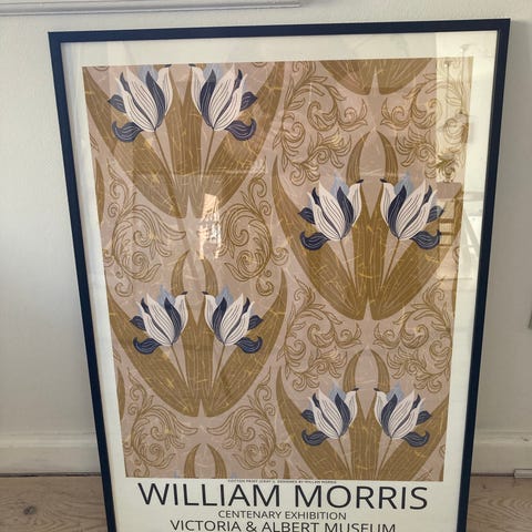 Plakat fra William Morris udstillingen på Nivågaard. Professionelt indrammet i sortmalet træramme.