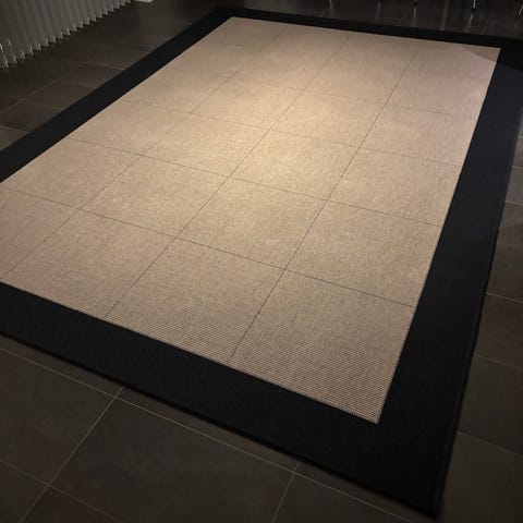 Casablanca uldtæppe med sort kant og lyse felter 160 x 240 cm. Brugt men meget velholdt.