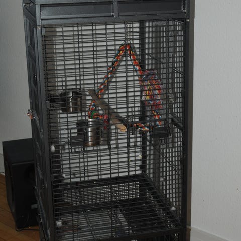 Fuglebur med blå plastbund og metalgitter. Buret har en buet top og inkluderer en madskål samt grene til fugle. Velegnet til små fugle. 64/55/36 med drikkevand og madpakke med tilbehør.du kører kun 10 km at købe bur.