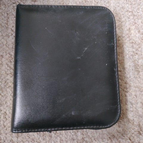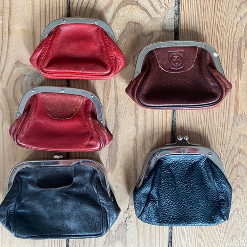 Vintage punge i faux læder til unisex. Pungene har en rund form med en lukning i toppen. Materialet er sort faux læder, og designet er enkelt og funktionelt.