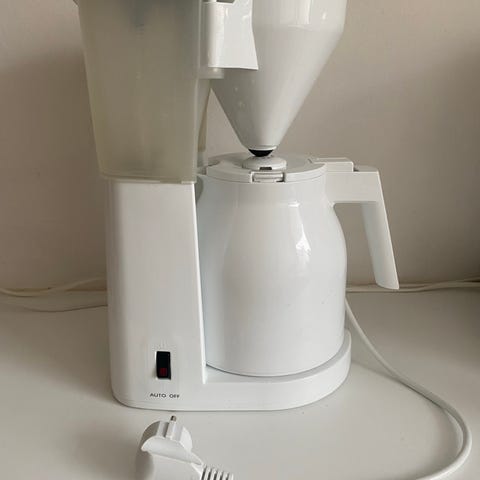 Melitta kaffemaskine med glaskande. Kaffemaskinen har et hvidt kabinet og en sort glaskande med håndtag. Velegnet til brygning af kaffe til flere kopper ad gangen.