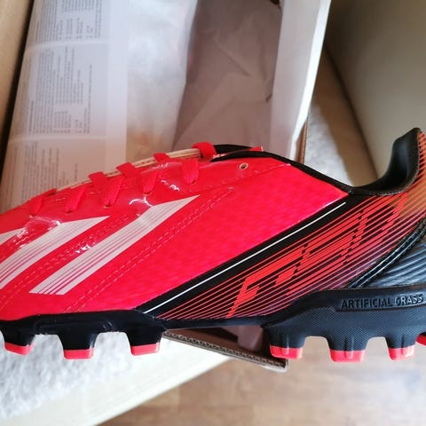Adidas fodboldstøvle i lyseblå farve. Støvlerne har en letvægtskonstruktion og er designet til fast græsunderlag med konfigurerede knopper for bedre greb og acceleration.