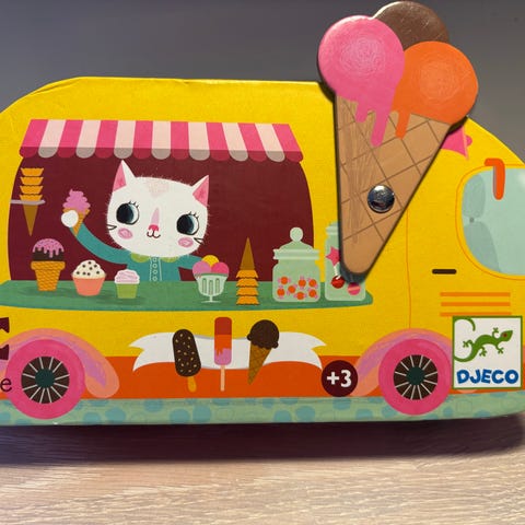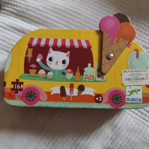Djeco Le Glacier puslespil med 16 brikker designet til børn over 3 år. Puslespillet er lavet af pap og har et farverigt motiv med isvogn og figurer.