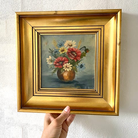 Malet pa lærred, indrammet i en solid forgyldt træeramme.