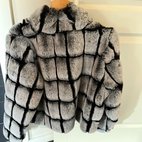 Kunst pels jakke i brun farve, størrelse M. Jakken er fremstillet i imiteret pelsmateriale og designet til kvinder. Den er en kort model og er som ny