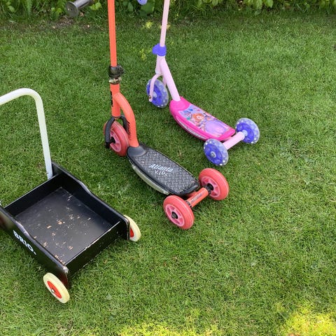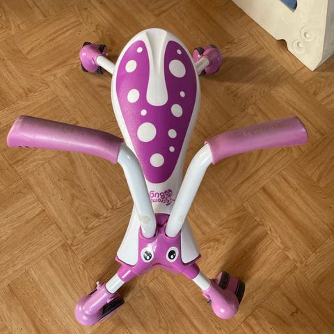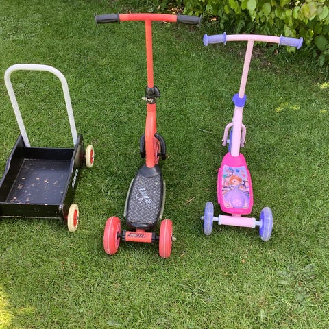 Zero 4 Løbevogn i rød farve. Fremstillet med tre hjul og en robust ramme, designet til transport af børn eller bagage. Ikke klargjort. Sælges som afhentning.